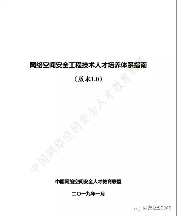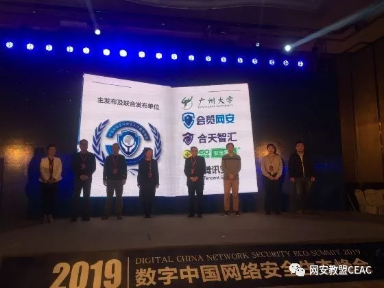 2019年1月11日,由中国网络空间安全人才教育联盟组织指导,广州大学、会览网安、合天智汇、360企业安全、腾讯安全等机构,以及行业资深专家参与设计编写的《网络空间安全工程技术人才培养体系指南(1.0版)》,在青岛“数字中国网络安全生态峰会”上正式发布。
