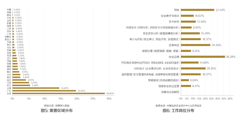 需求区域分布: 北京、广东、上海这三个省市是网络安全人才需求量最大的省份,这三个地方对网络安全人才需求的总量占全国需求总量的62.3%。其中,仅北京地区需求的网络安全人才,就占到全国的28.4%。从人才供给情况来看,北京、深圳、上海、西安、成都是网络安全人才比较集中的地区,求职者人数占比约为全国总量的78.8%,成都因为一系列举措,上升非常明显(见图5)。