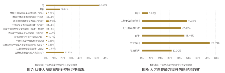 信息安全资质证书情况: 数据显示,持有各类信息安全资质证书的人数所占比例为31.17%。在持有资质证书的人员中,持有注册信息安全专业人员(CISP)的人群最多,占比达到21.22%。证书持有情况不容乐观,在信息安全资质证书中注册信息安全专业人员(CISP)认知度较高(见图7)。